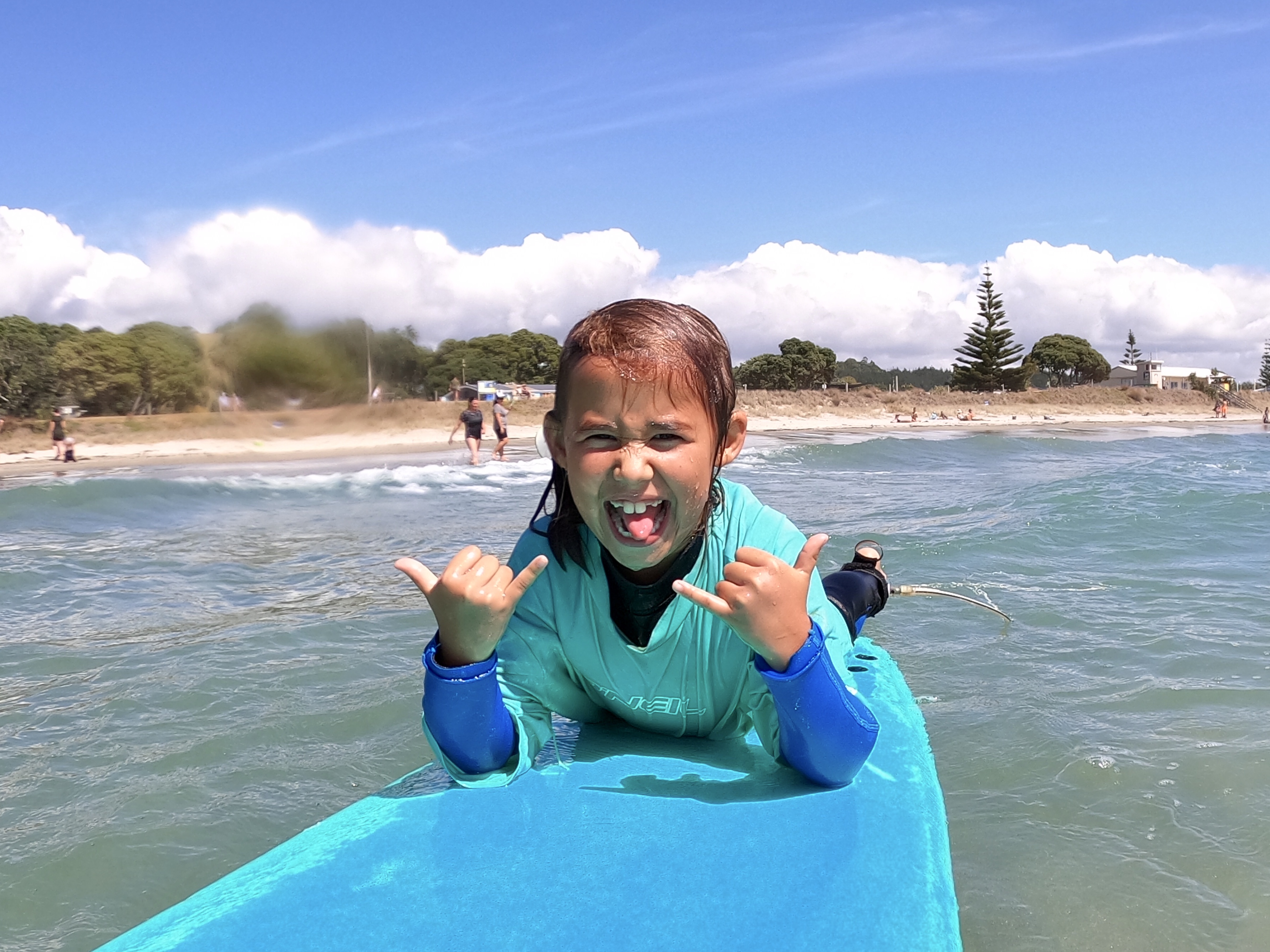 Generally we take kids from 5 yrs old in our group lessons. It is important that younger kids are not scared of the water though as the coach has the responsibility of several kids in the lessons. If you are unsure you can book in to do a private lesson first to build your child’s confidence. Check out our Private Lessons. We also recommend that parents are nearby during the lesson in case the child needs help transporting their board to and from the water. This is always a great chance to take some fun photos!!